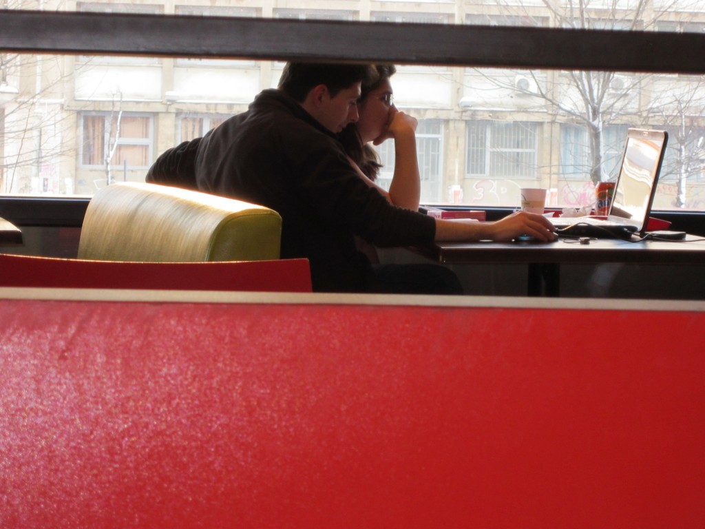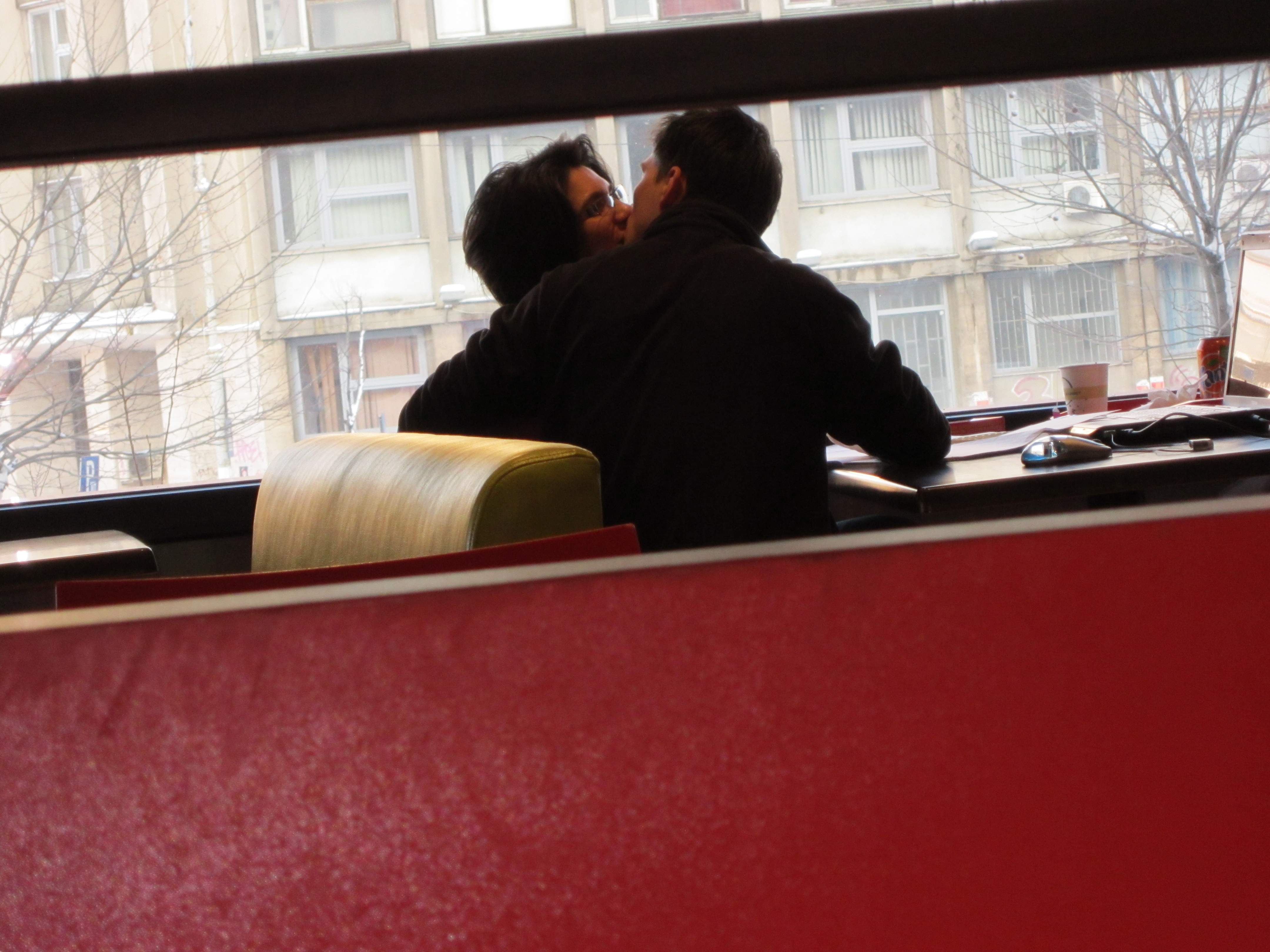 O zi senina cu soare stralucitor pe cer e o raritate in miezul iernii, asa ca, am ignorat gerul naprasnic si am pornit vitejeste prin oras curioasa foc sa aflu ce-i poate pielea micutului A 3200. Tinta? Parcul Cismigiu. Dupa cca o ora si 300 de poze, cu manile degerate, am oprit la un restaurant din drum pentru a-mi trage sufletul si a ma incalzi putin. Am comandat o pizza cu pui si un cappuccino. La o masa vecina am zarit doi indragostiti (unul de altul si impreuna de internet) si mi-am exersat putin talentul de paparazzo. Veti vedea mai jos ce cadre incendiare am imortalizat.